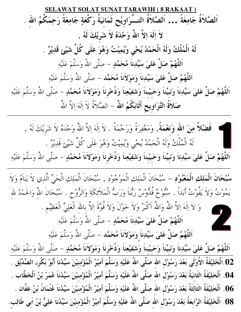 Dalam tarawih dengan 20 rakaat, selawat dan taradhdhi ini dibagi menjadi 10 bagian untuk salat tarawih dan dua bagian untuk salat witir. Setelah selesai 8 atau 20 rakaat dan bacaan selawat, imam mengakhiri solat sunat tarawih dengan membaca doa ini:. Bacaan selawat, tasbih dan doa solat tarawih. Ramadhan semakin tiba.anda masih ragu2 dalam selawat terawih?